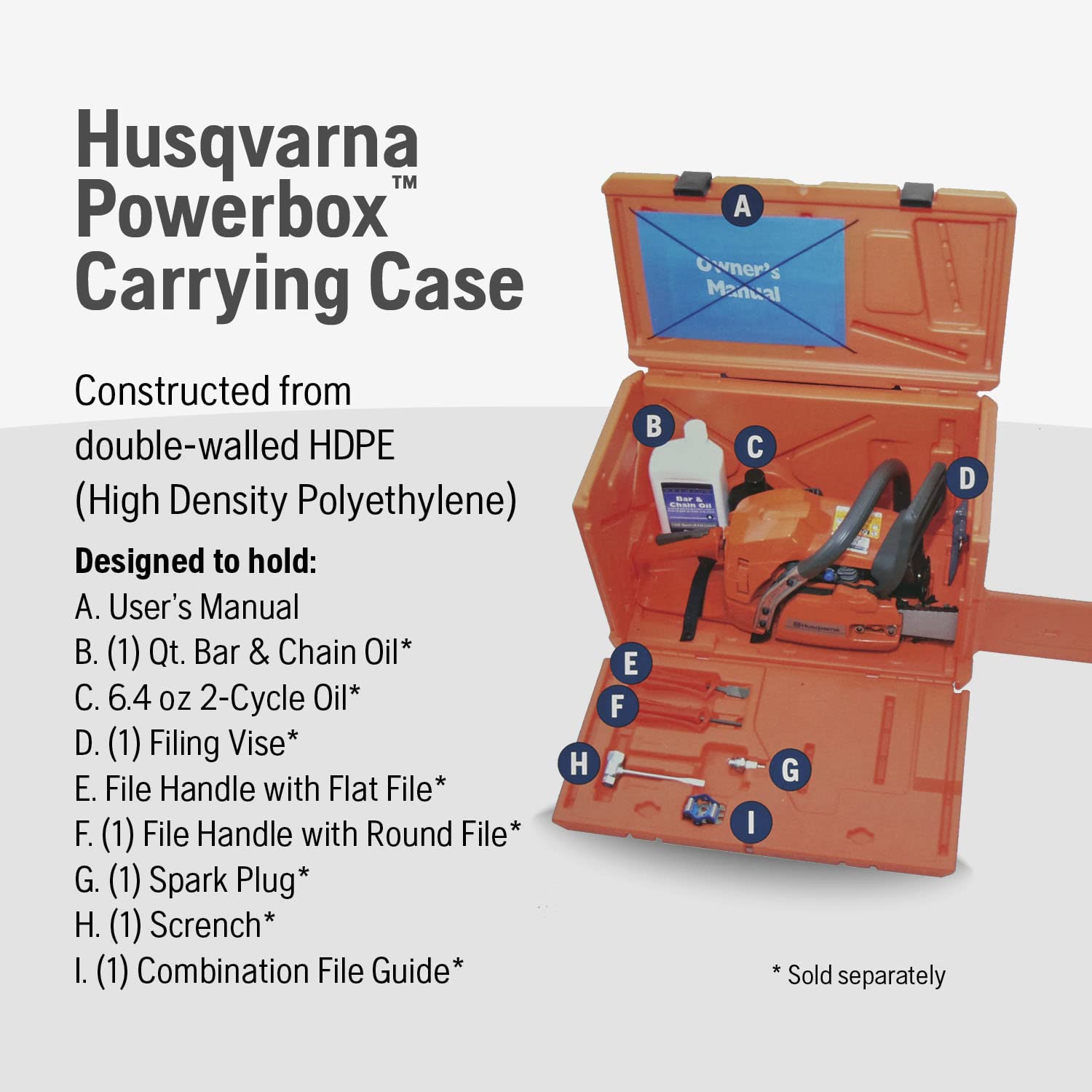 - Includes one Husqvarna Powerbox Chainsaw Carrying Case for Husqvarna chainsaw models: 120, 130, 135, 365, 372 XP, 435, 440, 445, 450 Rancher, 455 Rancher, 460 Rancher, 540 XP, 545, 550 XP, 555, 562 XP, 565, 572 XP, T525, T435, and T540 XP