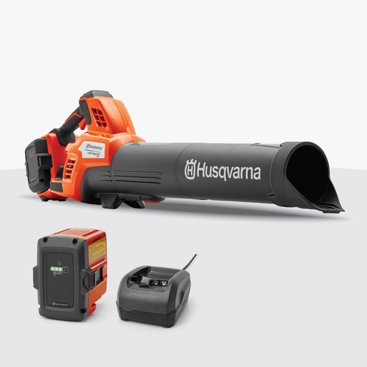 Experience the ideal combination of power and comfort with the Husqvarna 230iB Cordless Leaf Blower with battery and charger. This electric leaf blower has a brushless motor that generates wind speeds of up to 136 MPH with 650 CFM air flow for maximum performance. The perfectly balanced, lightweight design (at only 8.4 lbs) ensures less strain on your arms, shoulders and back when using this cordless blower. A simple tap on the intuitive keypad starts the rechargeable leaf blower instantly, and cruise control lets you fully focus on blowing leaves and debris away. These cordless leaf blowers also have a power boost mode, giving you 20 percent more power. Exceptionally quiet, this battery leaf blower lets you work without disturbing your neighbors. A built-in debris scraper simplifies moving wet, sticky debris. Ideal for homeowners, this versatile battery powered leaf blower is designed for year-round use, whether you're using these blowers for lawn care or blowing debris out of the garage. The electric blower comes with a 40V lithium-ion battery for extended run time and a charger for speedy recharging, so you can get to work right away. All Husqvarna batteries are interchangeable among all Husqvarna handheld tools for flexible use.