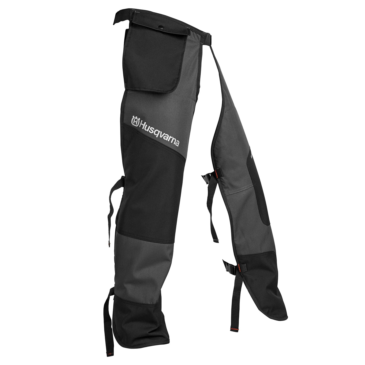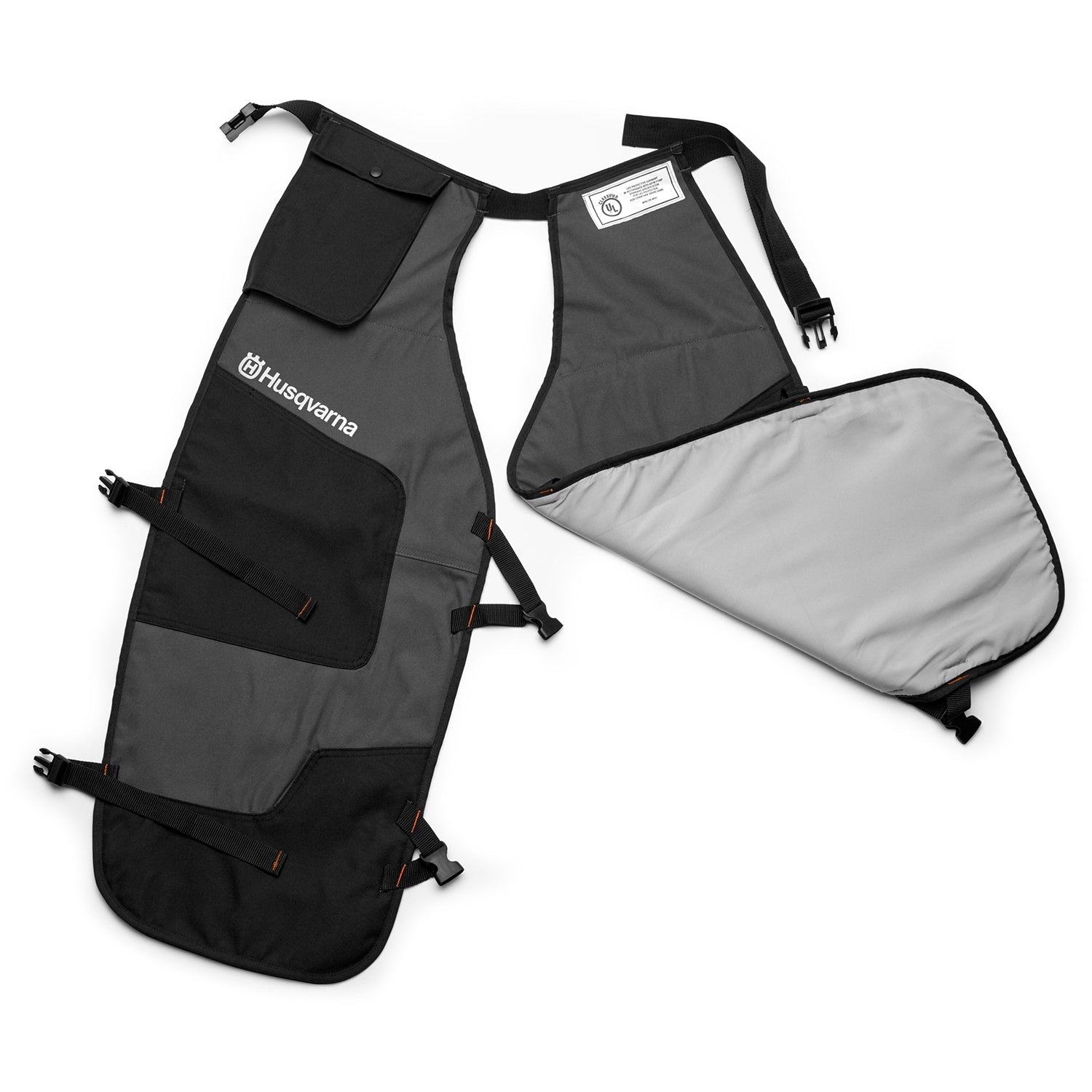 Upgrade your personal protective equipment with Husqvarna Classic Apron Chainsaw Chaps. These Husqvarna chainsaw chaps contain PVC-coated 600 Denier polyester with Tek Warp protective layers, designed to reduce the risk or severity of an injury and give the operator extra reaction time when contact is made by a moving chain. Heavy-duty, cut-retardant material is fashioned to "pull" apart and clog up the sprocket system of a chainsaw to slow or stop the chain from rotating, depending upon the speed of the chain, length, angle of contact and power of the saw. Husqvarna chainsaw chaps also feature adjustable waist sizes (up to 38 inches), Acetyl Delran buckles and a felling wedge pocket for gear. Wash these chaps in cold water with mild detergent and hang them to dry. Protective chaps should never be considered safer than proper chainsaw handling safety procedures. This chainsaw safety gear is UL certified and meets ASTM F1897, ANSI Z133.1 and OSHA regulation 1910-266.