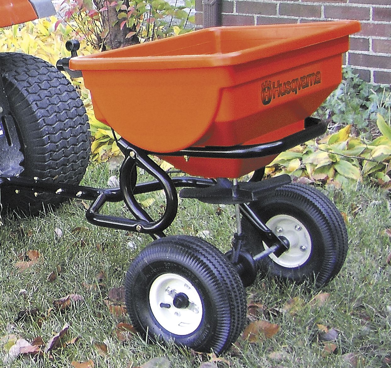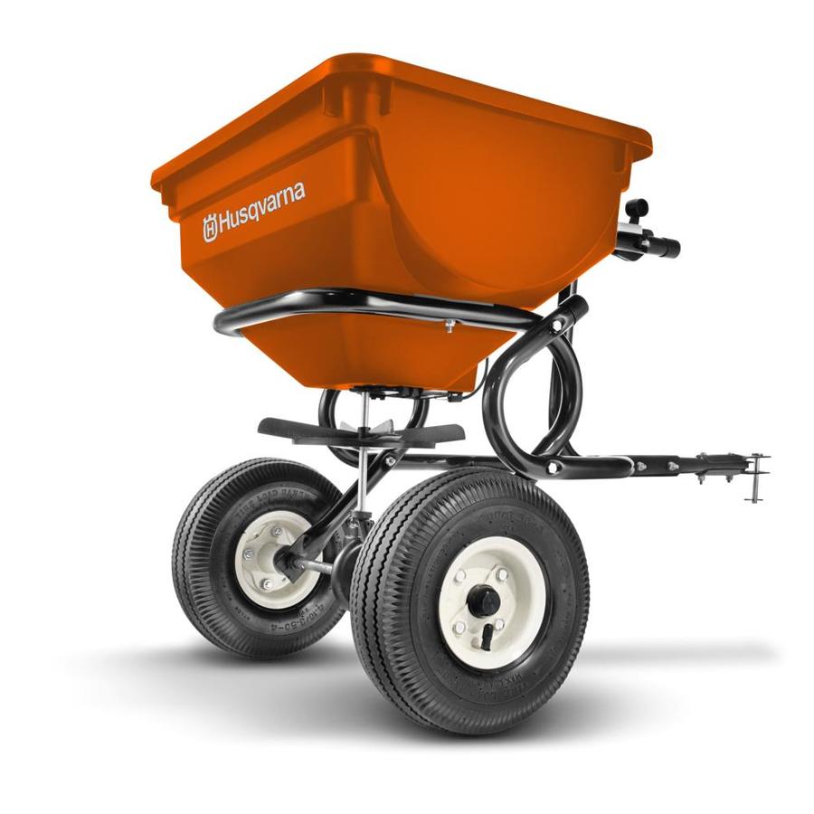 Husqvarna 588182902 85 Lb. Tow Behind Spreader with Hitch Pin, Tractor and Zero Turn Riding Mower Attachments