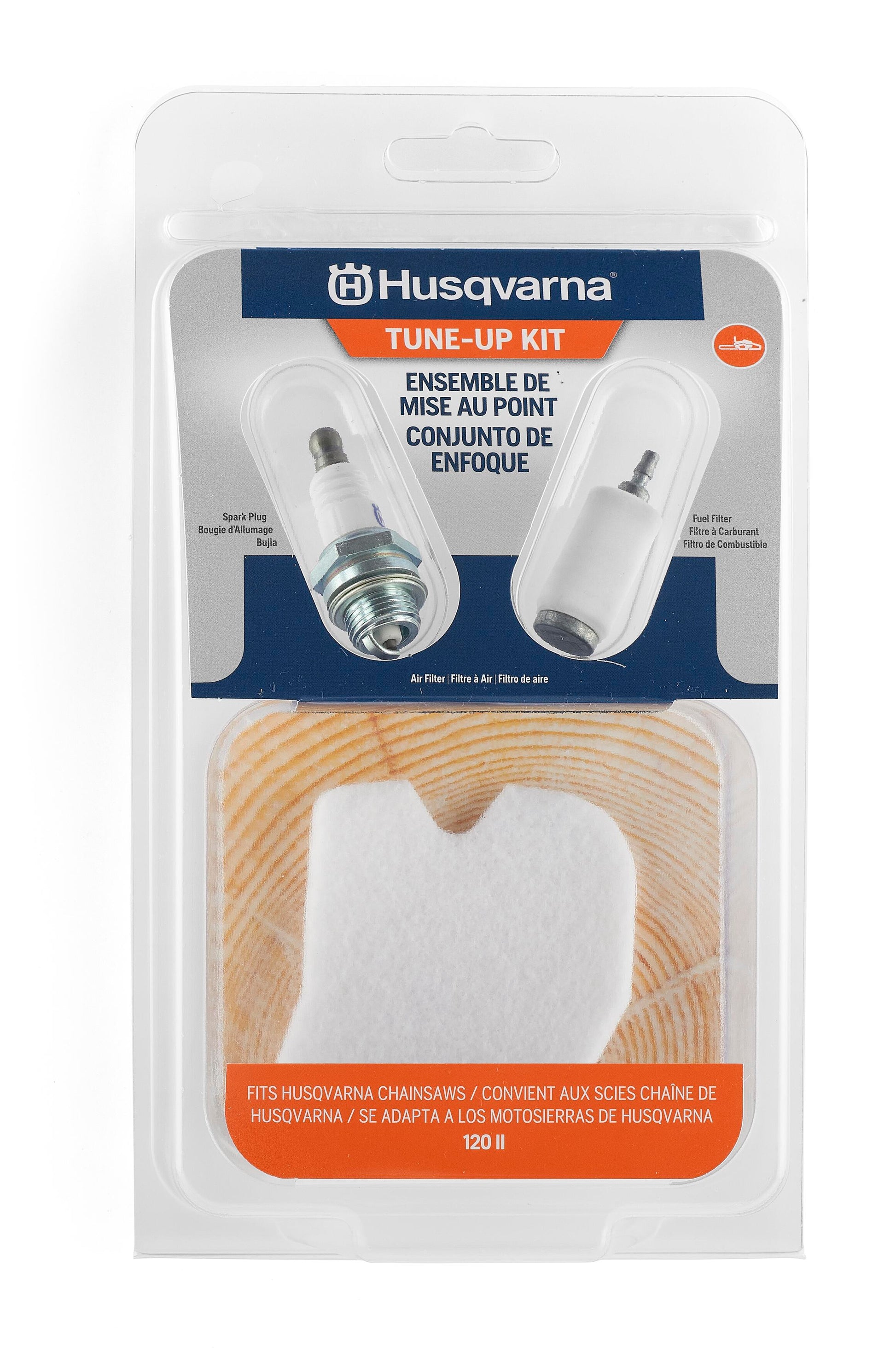 Keep your Husqvarna chainsaw running like new with an official Husqvarna tune up kit. This chainsaw accessory is compatible with Husqvarna 120 II chainsaw model. The Husqvarna Chainsaw Maintenance Kit has everything you need to keep your chainsaw running at peak performance. This convenient, all-in-one kit includes one Husqvarna fuel filter, one Husqvarna chainsaw air filter and one Husqvarna spark plug. Designed to ensure peak performance from Husqvarna engines, Husqvarna chainsaw parts are made of premium-quality materials to keep your lawn equipment running at peak performance. Enjoy fast and efficient maintenance of your equipment with genuine Husqvarna replacement parts that are easy to install and maintain.