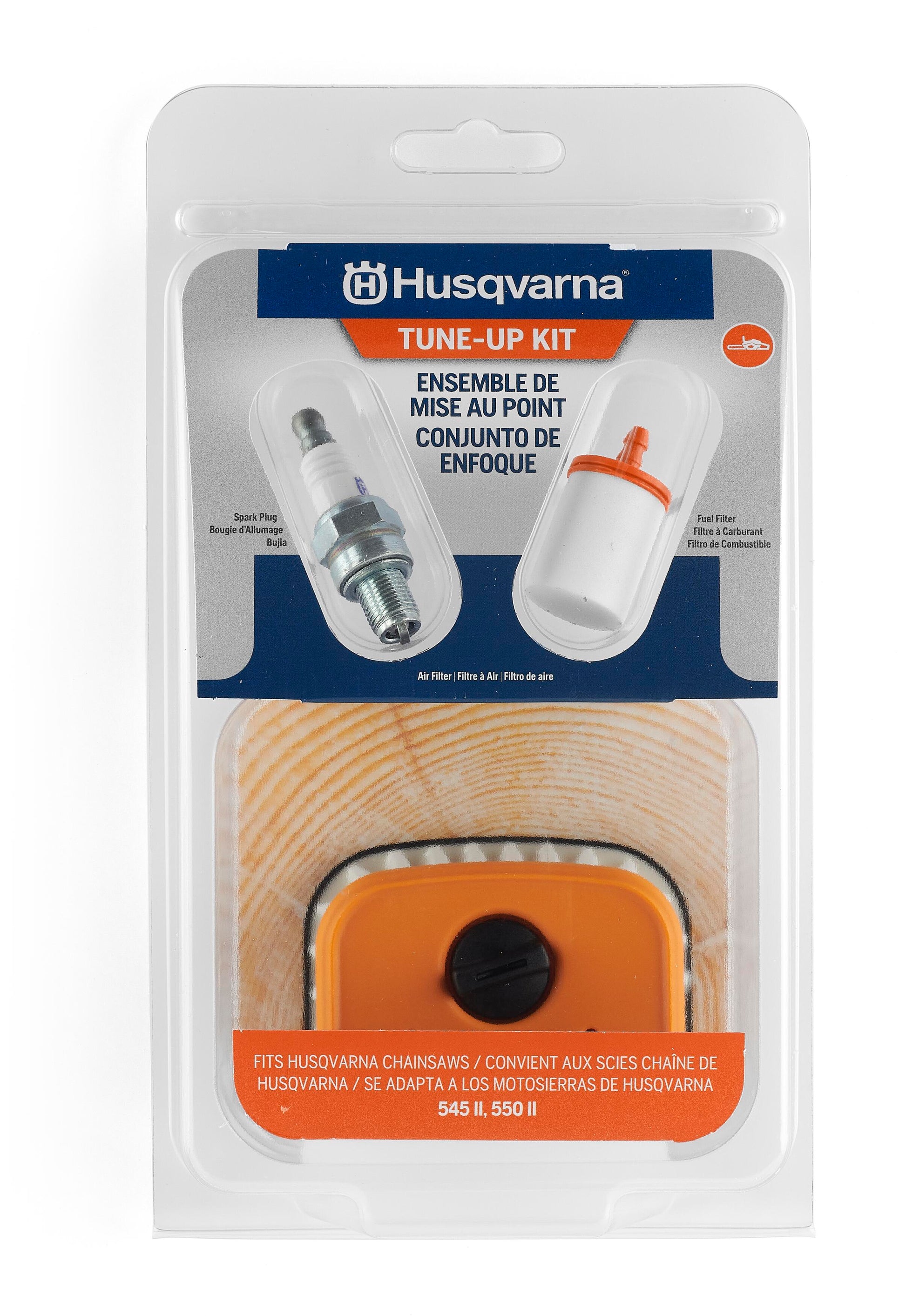 Keep your Husqvarna chainsaw running like new with an official Husqvarna tune up kit. These chainsaw accessories are compatible with Husqvarna 545 II and 550XP II chainsaw models. The Husqvarna Chainsaw Maintenance Kit has everything you need to keep your chainsaw running at peak performance. This convenient, all-in-one kit includes one Husqvarna fuel filter, one Husqvarna chainsaw air filter and one Husqvarna spark plug. Designed to ensure peak performance from Husqvarna engines, Husqvarna chainsaw parts are made of premium-quality materials to keep your lawn equipment running at peak performance. Enjoy fast and efficient maintenance of your equipment with genuine Husqvarna replacement parts that are easy to install and maintain.