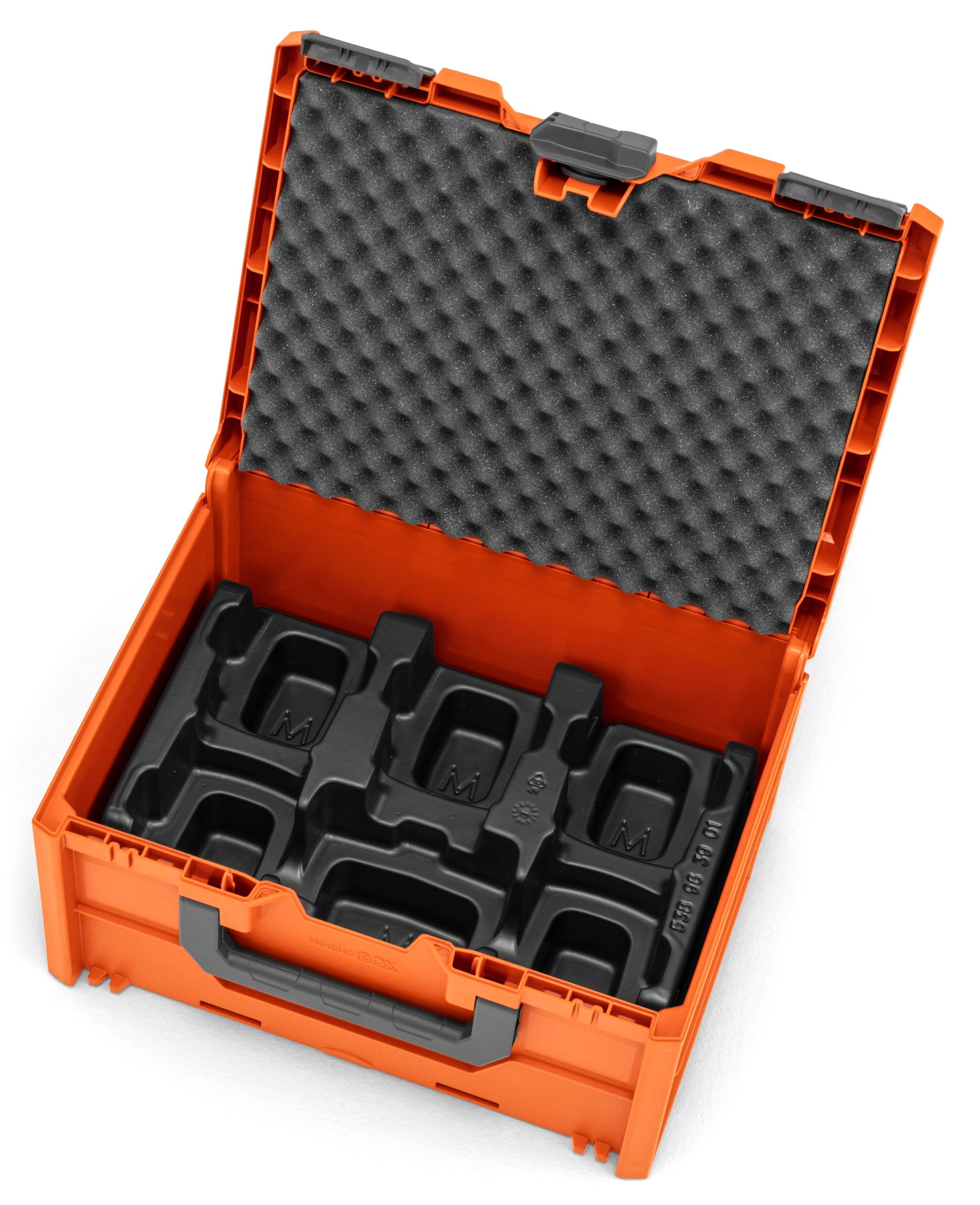 Husqvarna Battery Box with M Insert is a robust and handy case for transportation and storage of up to 6pcs of Husqvarna 40V M size* lithium-ion batteries. Ergonomic handles placed on both front and top for easy handling. The well thought-out design allows for stacking of multiple boxes and by adding the Husqvarna multi adapter plate (to be sold separately), the box can also be connected to third-part case systems. Insert M included. *Husqvarna 40V M size batteries = Bli10/BLi20/BLi100/BLi200/BLi200X