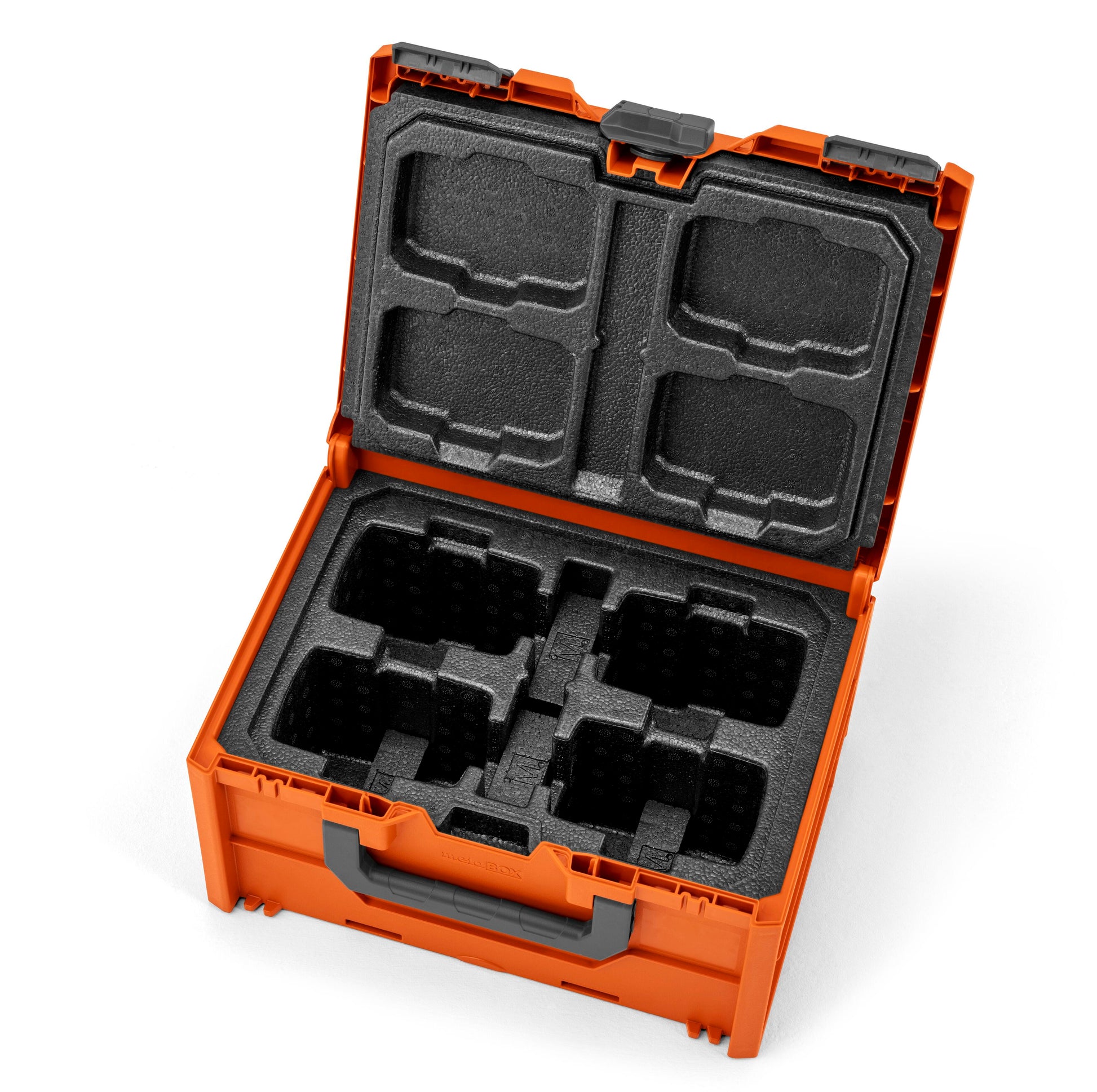 Husqvarna Battery Transportation Box is a robust, light-weight case that holds up to four Husqvarna 40V batteries. This case is UN3480 certified for safe transportation of lithium-ion batteries on air, land or sea. Furthermore, the integrated insert provides excellent thermal insulation and great shock absorption during transport. Ergonomic handles are placed on both front and top for easy handling. This well thought-out design allows for stacking of multiple boxes. By adding the Husqvarna multi adapter plate (to be sold separately), the box can also be connected to third-part case systems.