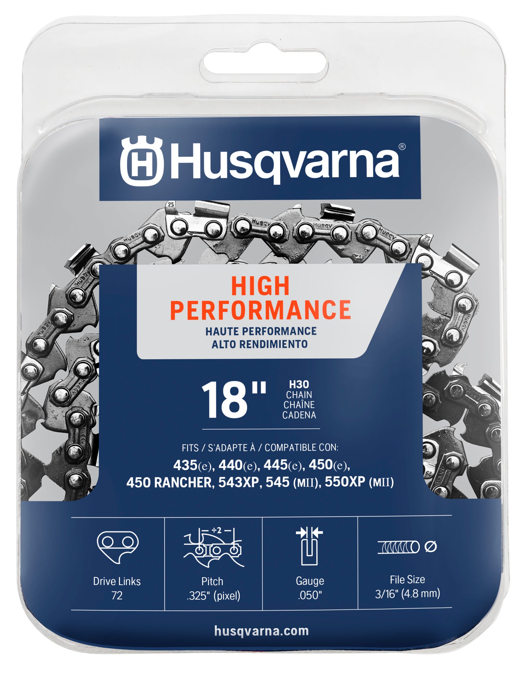 Give your chainsaw excellent precision and performance with the Husqvarna H30 Narrow Kerf 18 Inch Chainsaw Chain. This Husqvarna chainsaw chain is compatible with the following gas chainsaw 18 inch models: 435(e), 440(e), 445(e), 450(e), 450 Rancher, 543XP, 545(MII) and 550 XP(MII) models. Due to their smooth operation, lasting sharpness and low kickback, these chainsaw chains are developed to meet the specific needs of today's lightweight chainsaws. This replacement chainsaw chain generates high cutting efficiency while improving maneuverability and reducing strain on the body. Husqvarna chainsaw parts are highly durable from a balanced combination of materials and manufacturing processes. In addition, they are pre-stretched at the factory to work longer without needing to be adjusted. With excellent precision and performance in narrow spaces, this chainsaw blade replacement is suitable for commercial cutters, arborists and occasional users.