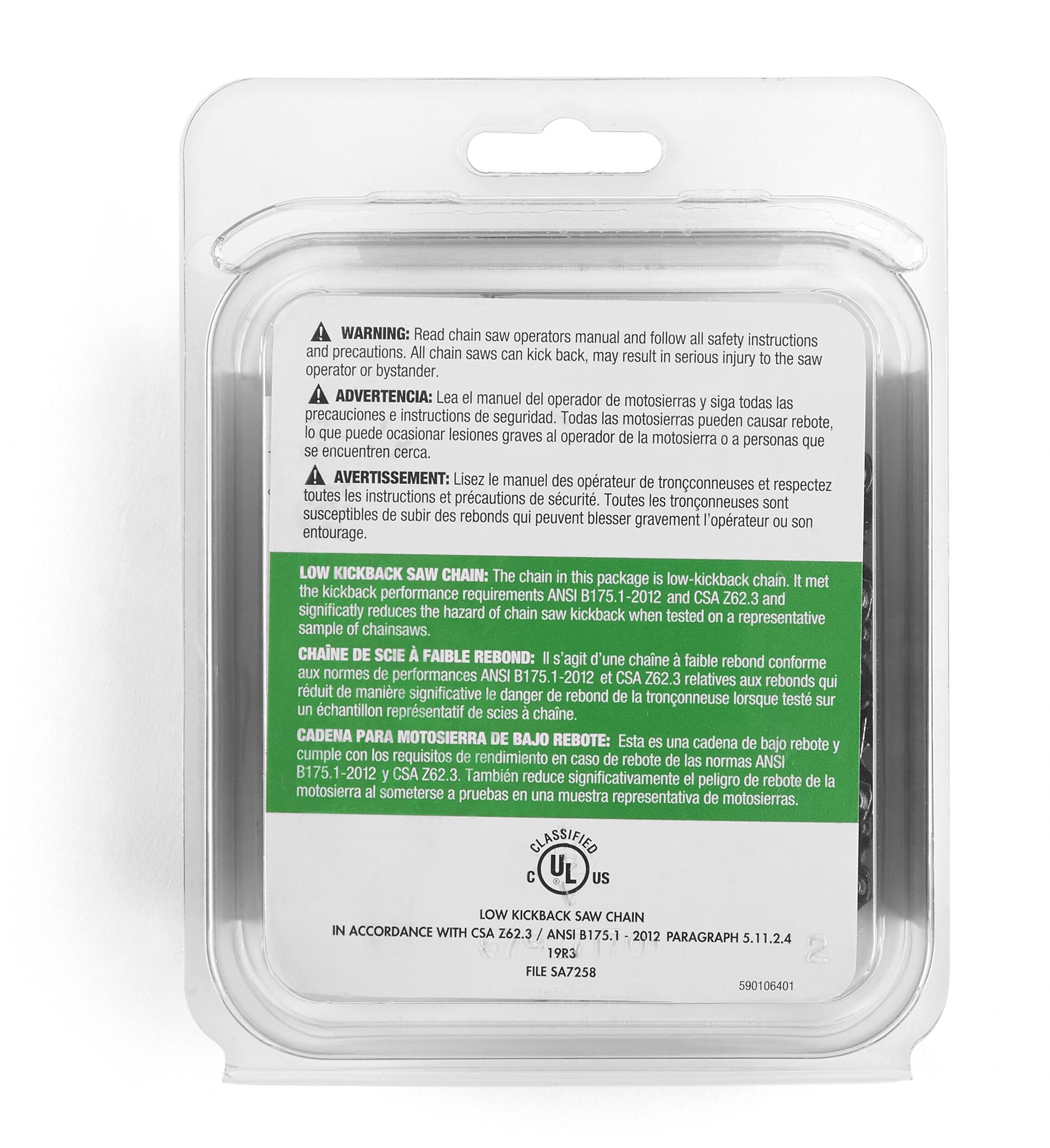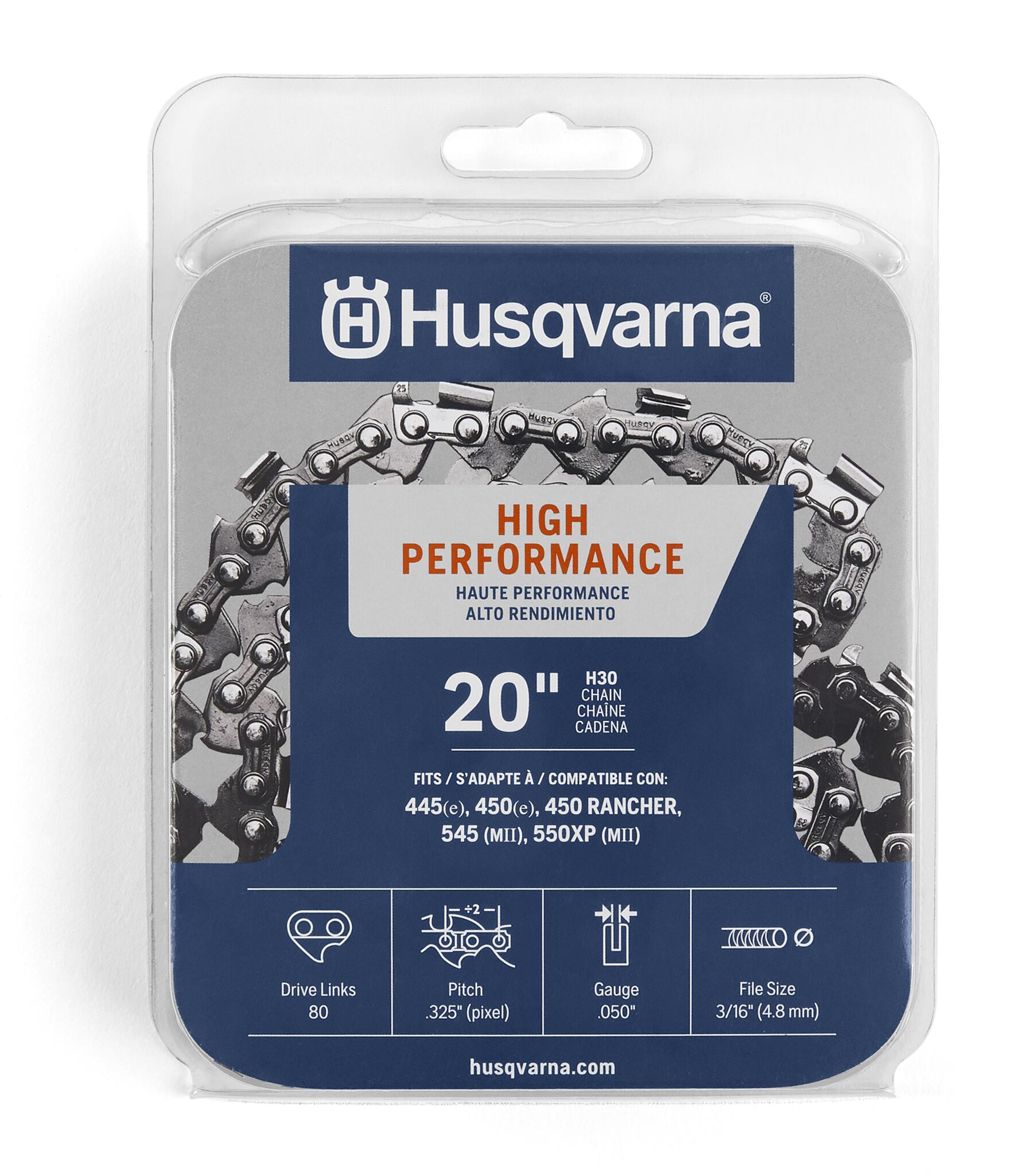 Give your chainsaw excellent precision and performance with the Husqvarna H30 Narrow Kerf 20 Inch Chainsaw Chain. This Husqvarna chainsaw chain is compatible with the following gas chainsaw 20 inch models: 445(e), 450(e), 450 Rancher, 545(MII) and 550 XP(MII) models. Due to their smooth operation, lasting sharpness and low kickback, these chainsaw chains are developed to meet the specific needs of today's lightweight chainsaws. This replacement chainsaw chain generates high cutting efficiency while improving maneuverability and reducing strain on the body. Husqvarna chainsaw parts are highly durable from a balanced combination of materials and manufacturing processes. In addition, they are pre-stretched at the factory to work longer without needing to be adjusted. With excellent precision and performance in narrow spaces, this chainsaw blade replacement is suitable for commercial cutters, arborists and occasional users.