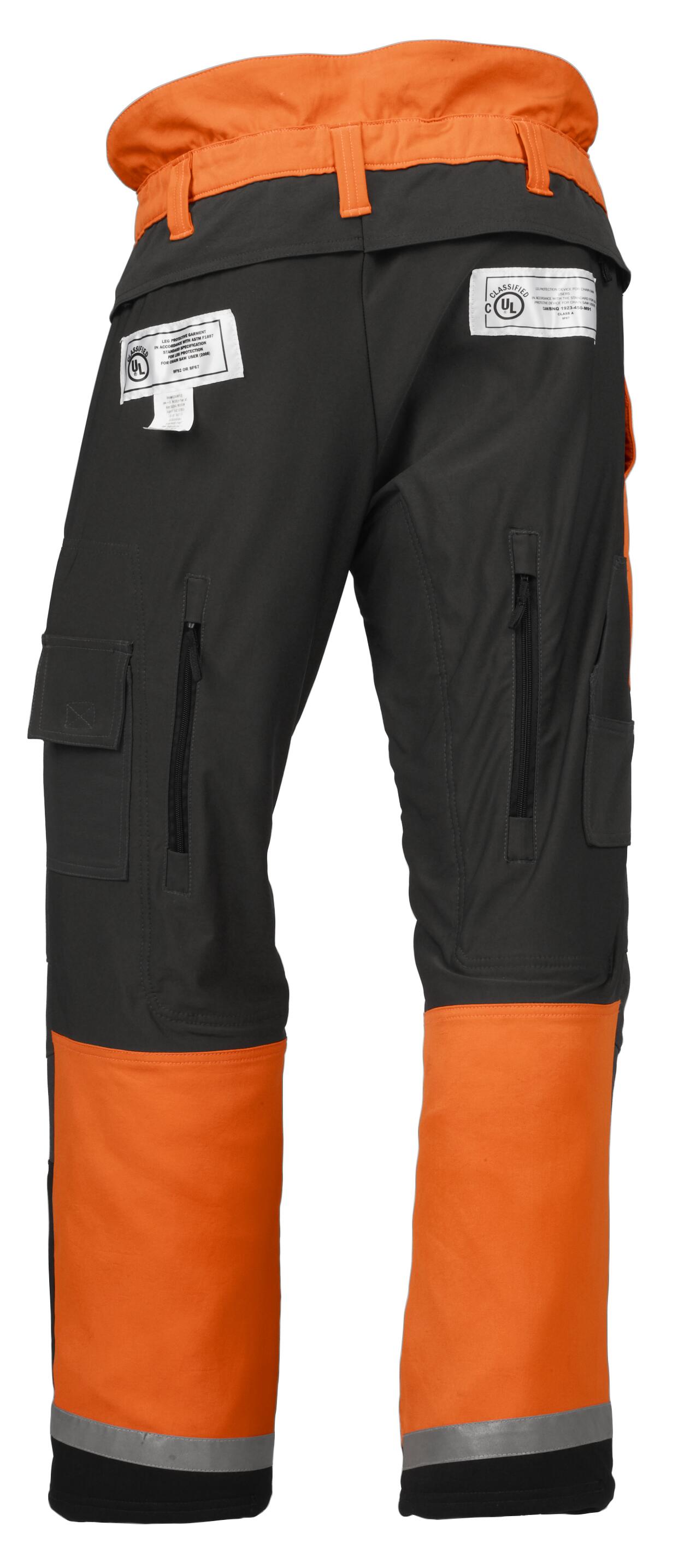 Husqvarna protective pants have been completely redesigned taking into consideration all customer needs including weight, temperature, fit , convenience and most importantly safety. The new Technical Hi-Viz Pants are setting a new standard for Husqvarna protective pants and offer may features and benefits any chainsaw user will appreciate. 4-Way stretch material and pre-bent knees for optimum movement. Ventilation areas (legs, back pockets) for breathability. Lightweight design for all day comfort. High visibility orange and reflective highlight for additional safety. Phone and gear pockets for added versatility. Certified chainsaw protective pant. Reinforced knees using Corduraยฎ. These pants are tested in Accordance with ASTM F1897 (US) for leg protection for chain saw users.