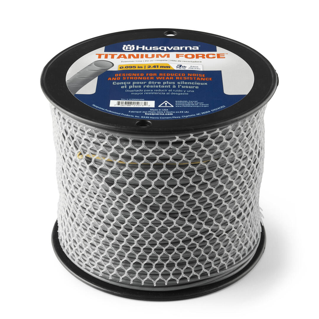 Take your trimming to the next level with Husqvarna Titanium Force String Trimmer Line. Made with commercial-grade copolymer trimmer line in a silver color, the Titanium Force design is based on cutting-edge technology that gives longer life, better performance, faster acceleration and level flight characteristics. This technology allows for reduced fuel consumption and low noise level for a better working environment. Husqvarna Titanium Force weed eater string is compatible with all standard string trimmer heads and is suitable for all-around use on a wide range of applications. This weed eater line provides great resistance to abrasion for long life and reduced breakage and features an undulated surface for quiet operation and precise cutting. Co-polymer-engineered resins improve the durability of this weed wacker string while maintaining flexibility. Husqvarna trimmer line works with both gas and cordless trimmers requiring a 0.095-inch trimmer line.