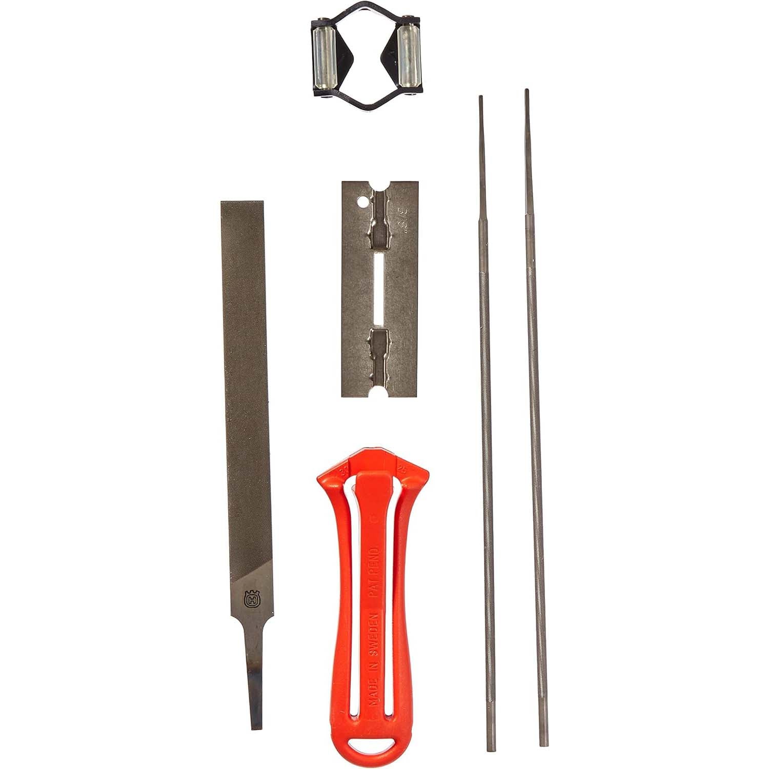 The Husqvarna 3/8 in. Pitch Low Profile Chainsaw Chain File Kit with Handle comes with everything you need to file your chain. The chainsaw chain file kit comes complete with a file handle, combination file guide (roller file guide and depth gauge in one), 2 round files, and 1 flat file for depth gauges. The combination gauge in this chain file kit also helps ensure the correct filing angle and simplifies the filing process.