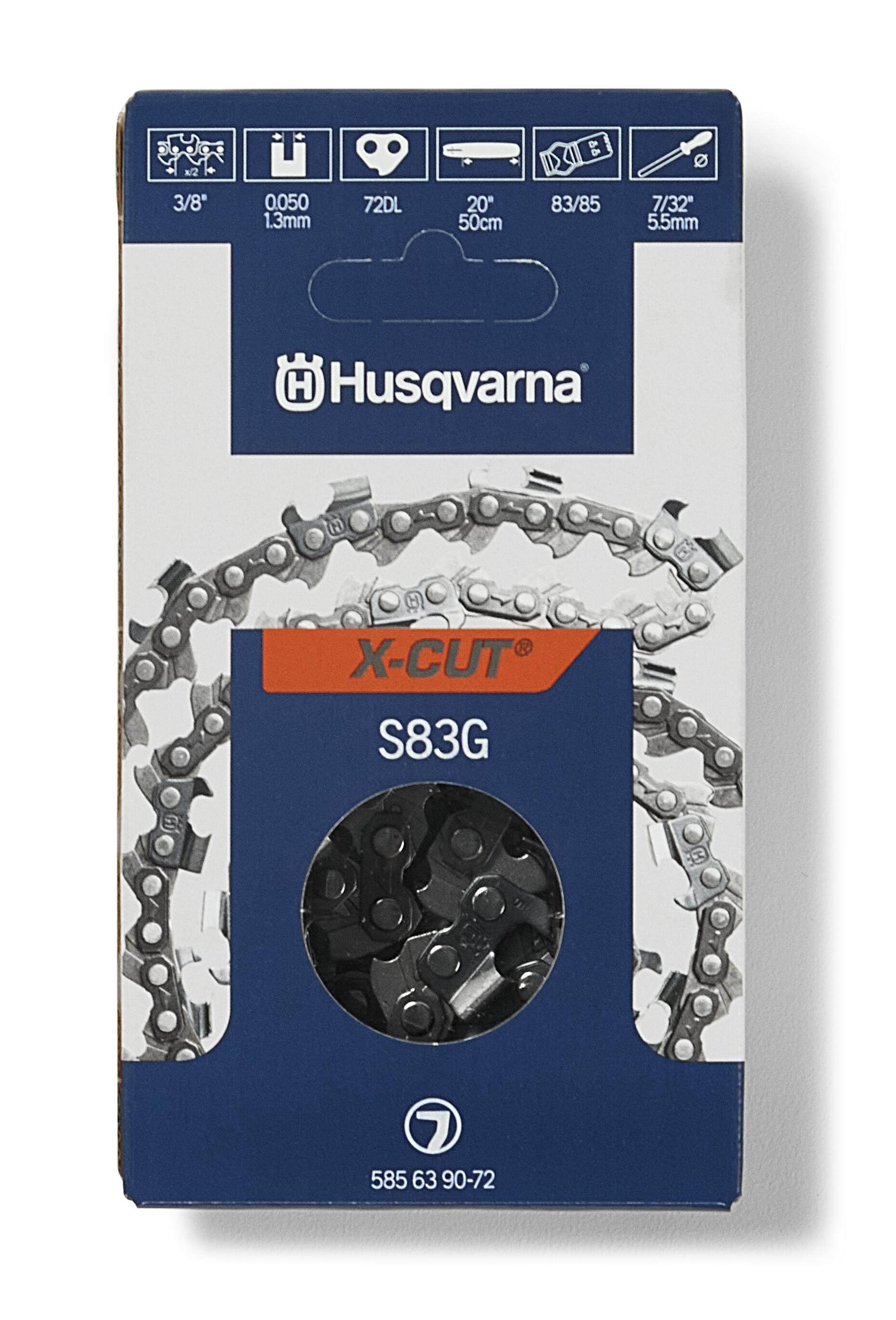The Husqvarna X-Cut S83G 20 inch chainsaw chain is a semi chisel, .3/8-inch pitch, .050-inch gauge, guarded chain that is designed, built and tested right next to Husqvarna chainsaws. Husqvarna chainsaw chains are robust and pre-stretched semi-chisel chains with guarded drive links for reduced kick-back. With a sharpness that lasts longer, high-cutting efficiency and less need for maintenance, these gas chainsaw accessories save time and money. Like all X-Cut chains, Husqvarna chainsaw blades are equipped with a golden tie-strap to indicate where to start and stop filing. This chainsaw blade is compatible with Husqvarna 460 Rancher and 455 Rancher models. Due to the smooth operation, lasting sharpness and low kickback, the Husqvarna chainsaw chain generates high-cutting efficiency while improving maneuverability and reducing strain on the body. Oil-shaped channels transport oil to the X-Cut for superior lubrication and less wear and tear on your Husqvarna chainsaw parts.
