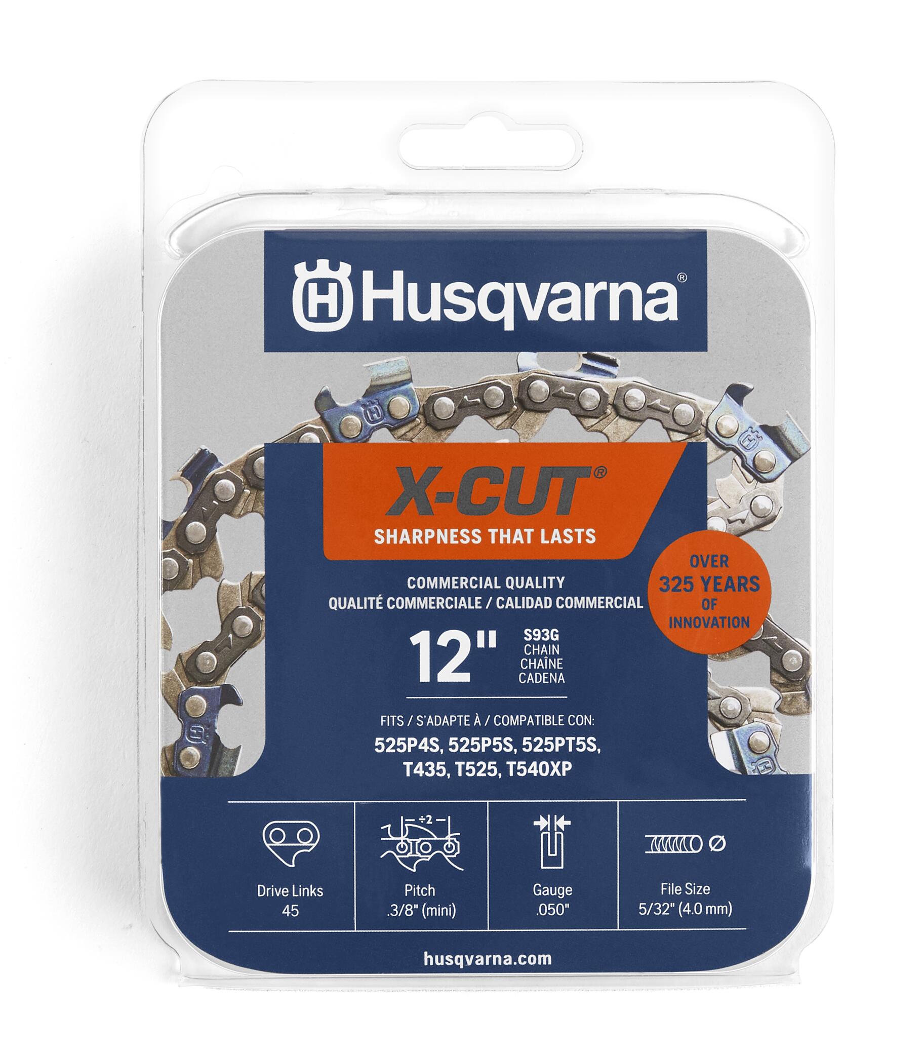 Give your chainsaw excellent precision and performance in narrow spaces with the Husqvarna X-Cut 12 Inch Chainsaw Chain. This chainsaw chain is compatible with the Husqvarna 525PT5S and 525DEPS models. Due to its smooth operation, lasting sharpness and low kickback, these Husqvarna chainsaw chains generate high cutting efficiency while improving maneuverability and reducing body strain. These reliable chainsaw accessories are designed with a balanced combination of materials and manufacturing processes to generate high durability. In addition, the replacement chainsaw chain is pre-stretched to work longer without needing to be adjusted. Oil-shaped channels in the links transport oil to the X-Cut for superior lubrication and less wear and tear on your Husqvarna chainsaw chain. With excellent precision and performance in narrow spaces, these chainsaw blades are ideal for arborists and suitable for everyday professional use and all standard cutting tasks.