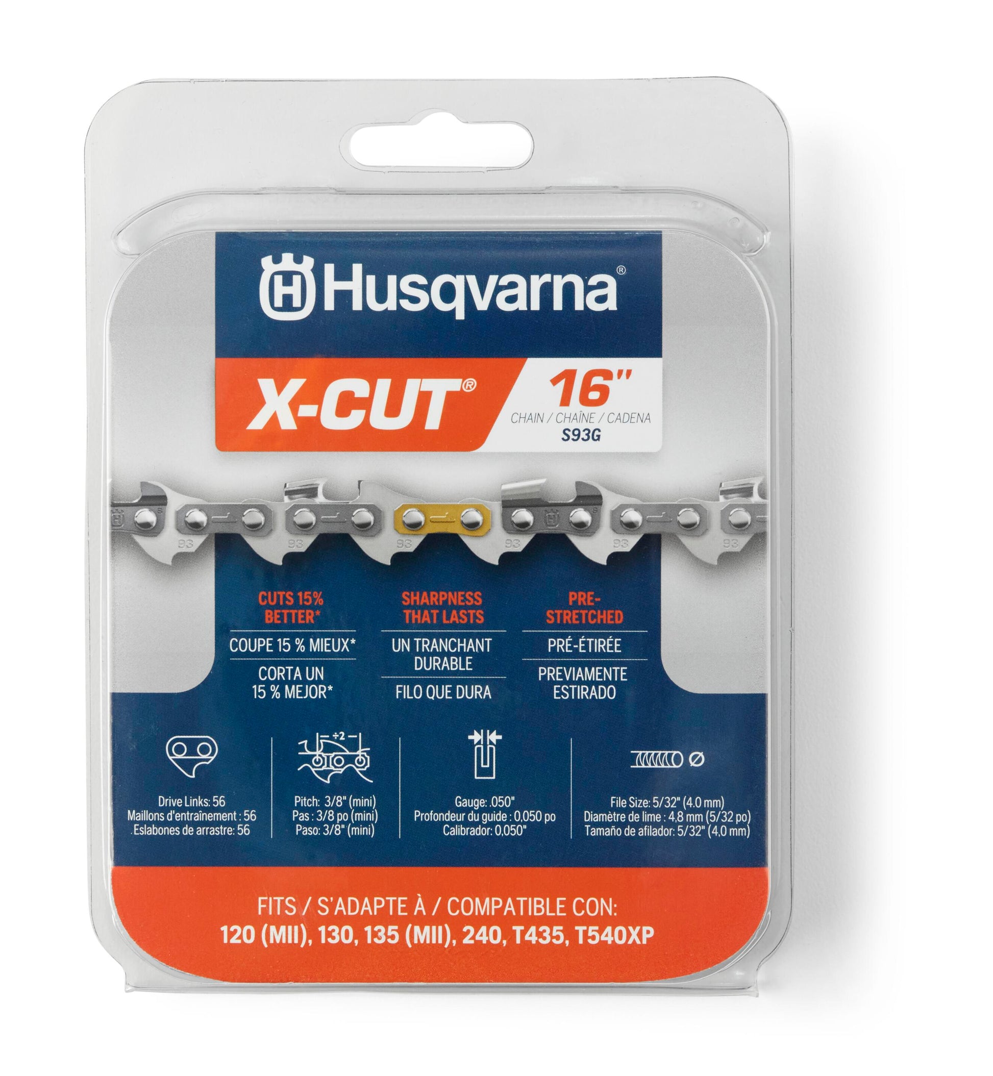 Give your chainsaw excellent precision and performance in narrow spaces with the Husqvarna X-Cut 16 Inch Chainsaw Chain. This chainsaw chain is compatible with the Husqvarna 120(MII), 130, 135(MII), T435, and 439 models. Due to its smooth operation, lasting sharpness and low kickback, these Husqvarna chainsaw chains generate high cutting efficiency while improving maneuverability and reducing body strain. These reliable chainsaw accessories are designed with a balanced combination of materials and manufacturing processes to generate high durability. In addition, the replacement chainsaw chain is pre-stretched to work longer without needing to be adjusted. Oil-shaped channels in the links transport oil to the X-Cut for superior lubrication and less wear and tear on your Husqvarna chainsaw chain. With excellent precision and performance in narrow spaces, these chainsaw blades are ideal for arborists and suitable for everyday professional use and all standard cutting tasks.