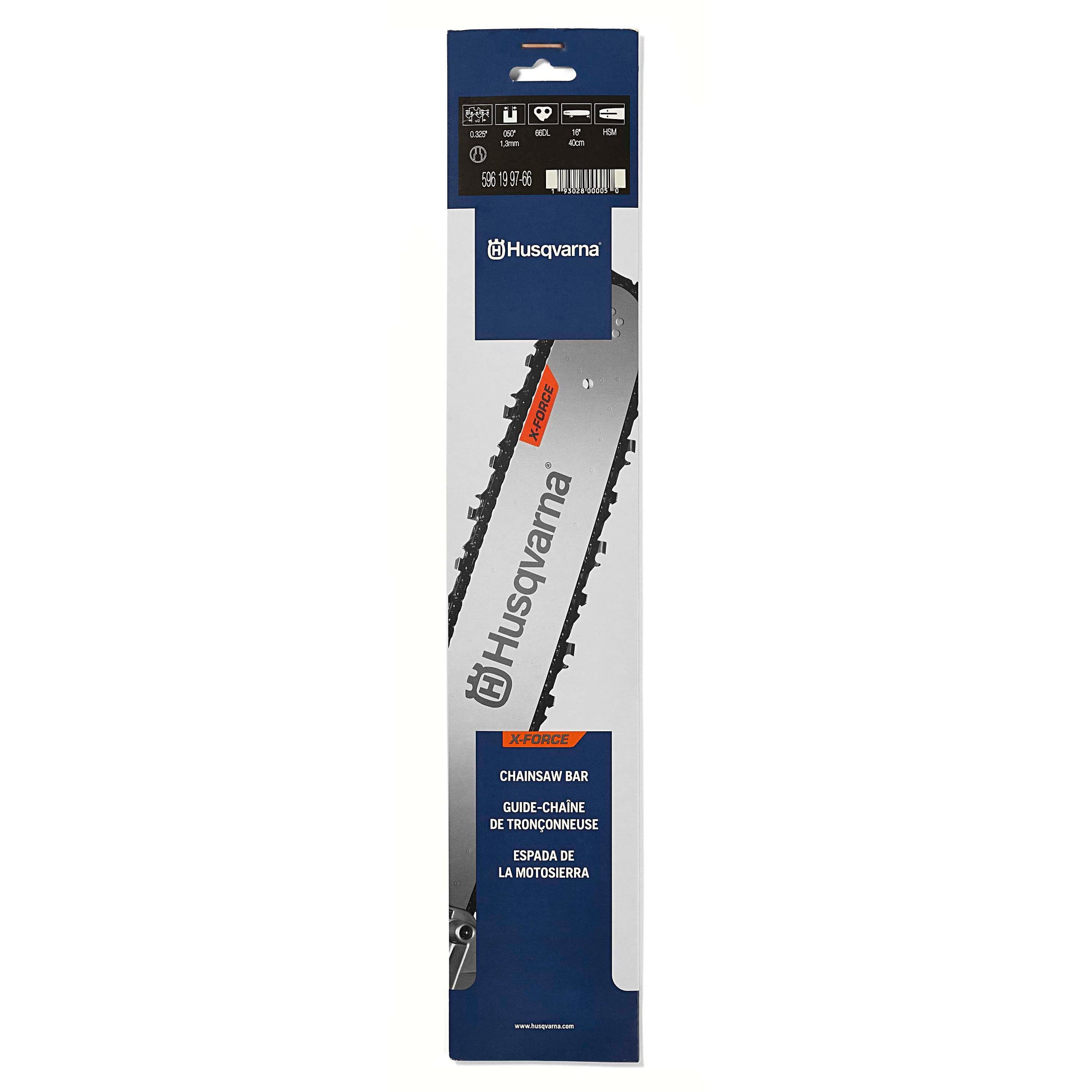 Experience more durability, less weight, and superior performance with the Husqvarna X-Force 16 Inch Chainsaw Bar. Husqvarna X-Force guide bars are developed with the X-Cut chains to get the best possible performance out of your Husqvarna chainsaw. A smooth, optimized profile, outstanding durability in the nose and bearing system, and an optimized center plate design provide minimum downtime and maximum results. The bearing system has support shields for increased productivity, and a no-grease hole prevents dirt from getting into the bearings while eliminating the need to replenish grease. Compatible with Husqvarna 435(e), 543XP, 545(MIII) and 550XP(MIII) models, this genuine Husqvarna chainsaw bar features a .325-inch pitch, .050-inch gauge, 66 drive links and a recommended 7/32" file size. Tough, hardened materials provide a smooth cutting experience. To accommodate other Husqvarna chainsaws, this 18 inch chainsaw bar is also offered in 13, 18 and 20-inch lengths.