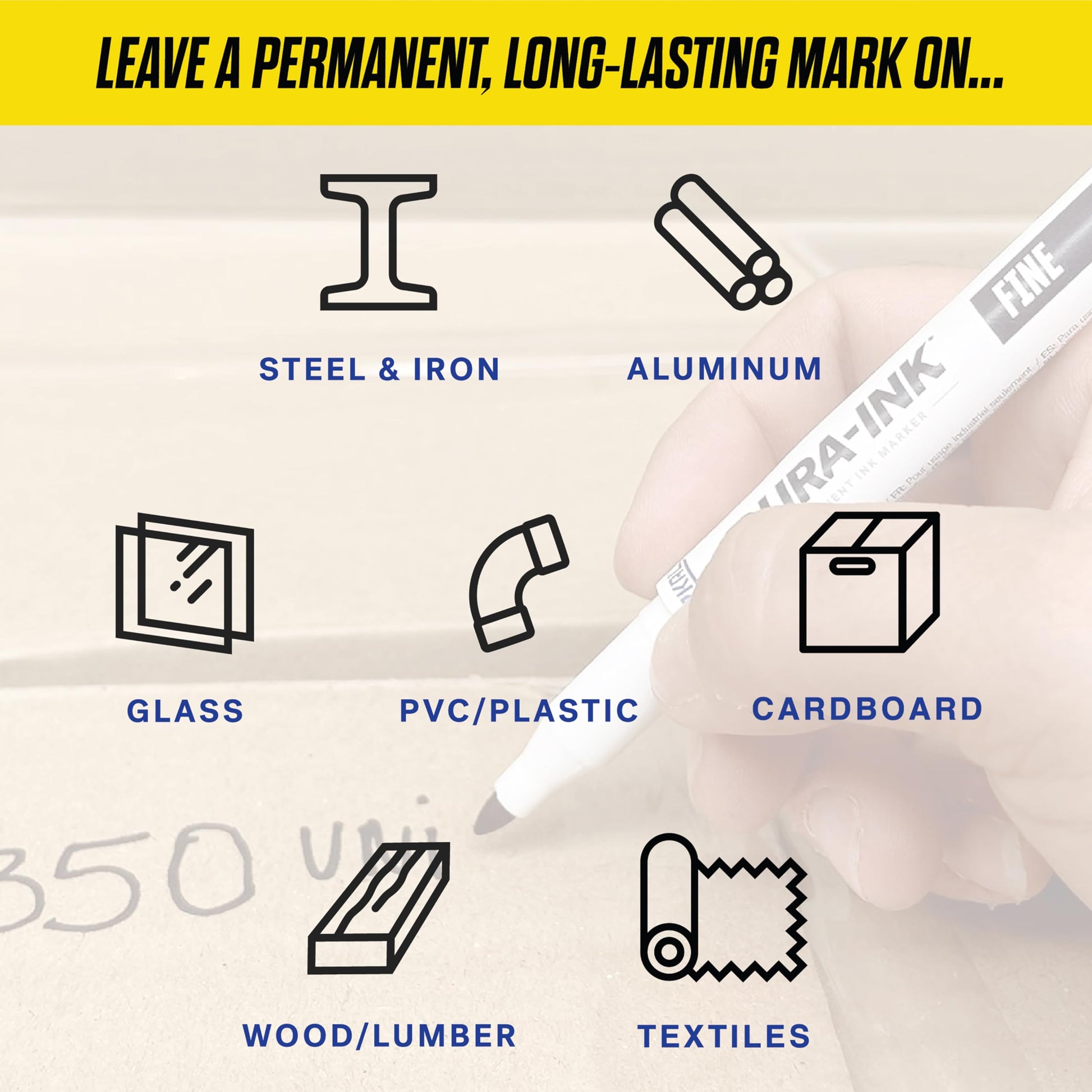 - Marks on metal, wood, cardboard, paper, plastic, glass