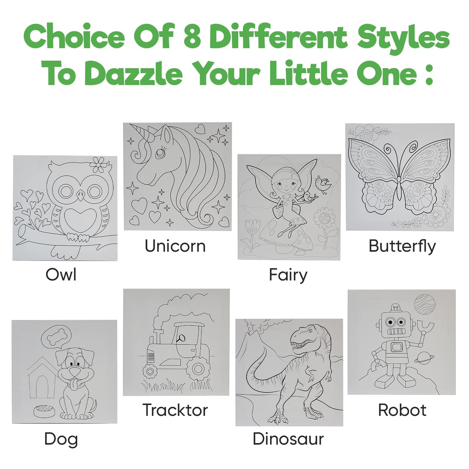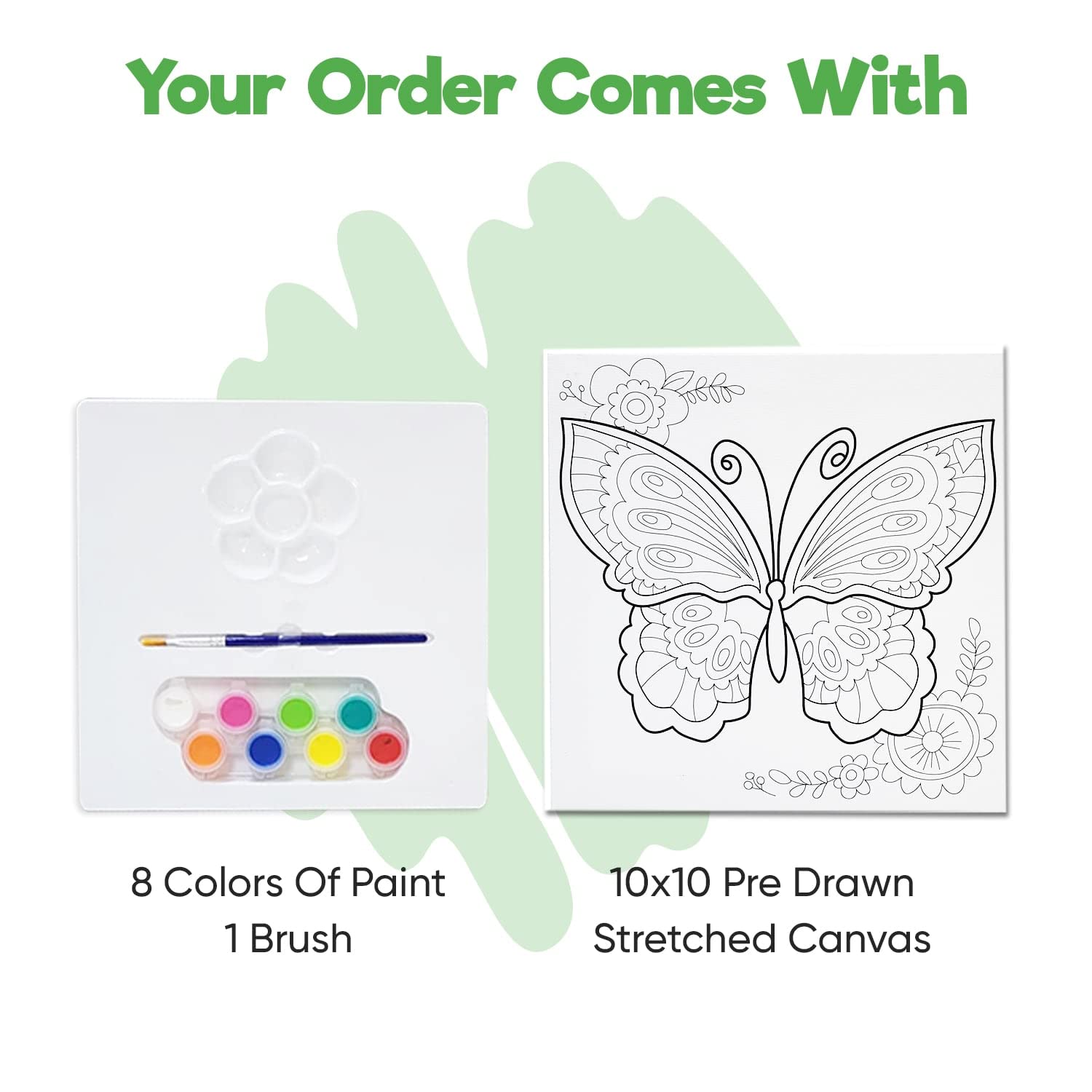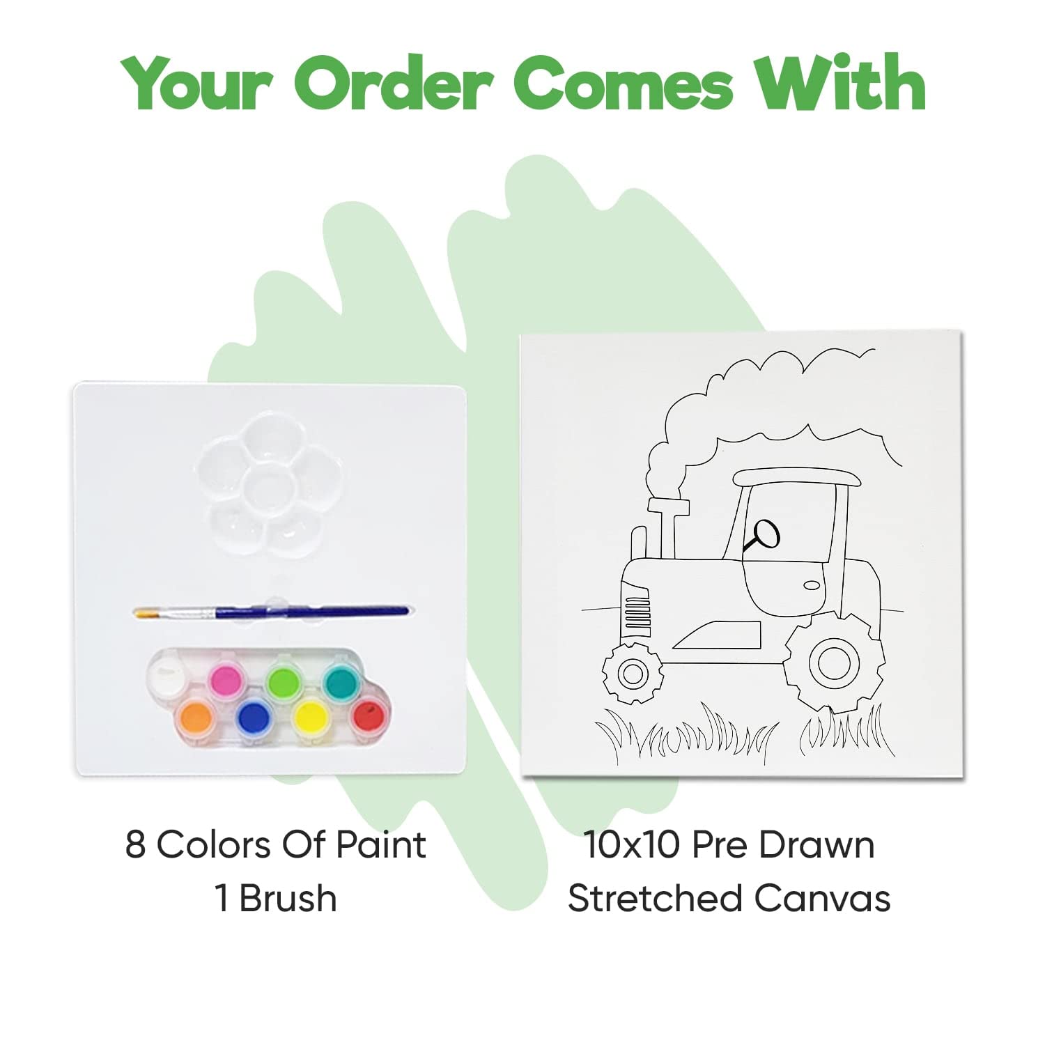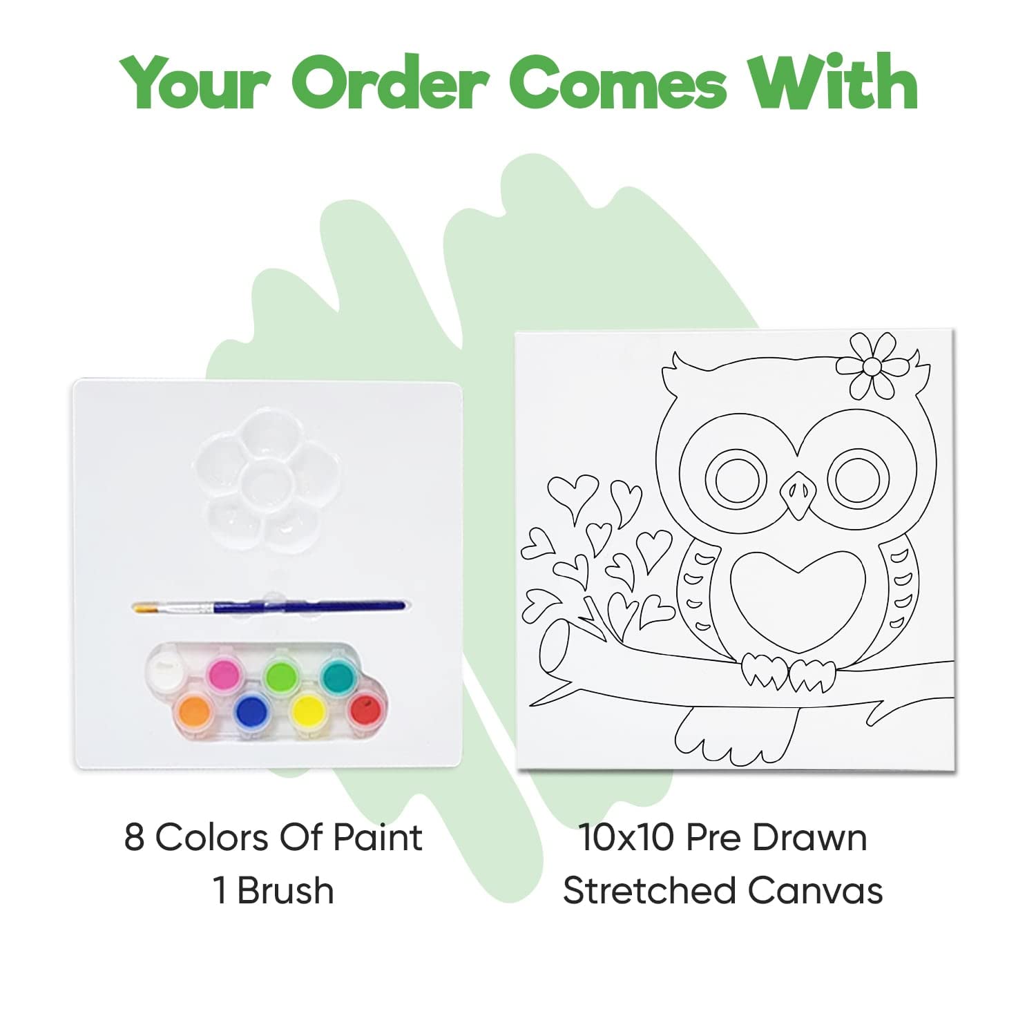 - Package Contents are, 10x10 Pre Drawn Stretched Canvas, 8 colors of paint, Sample image.