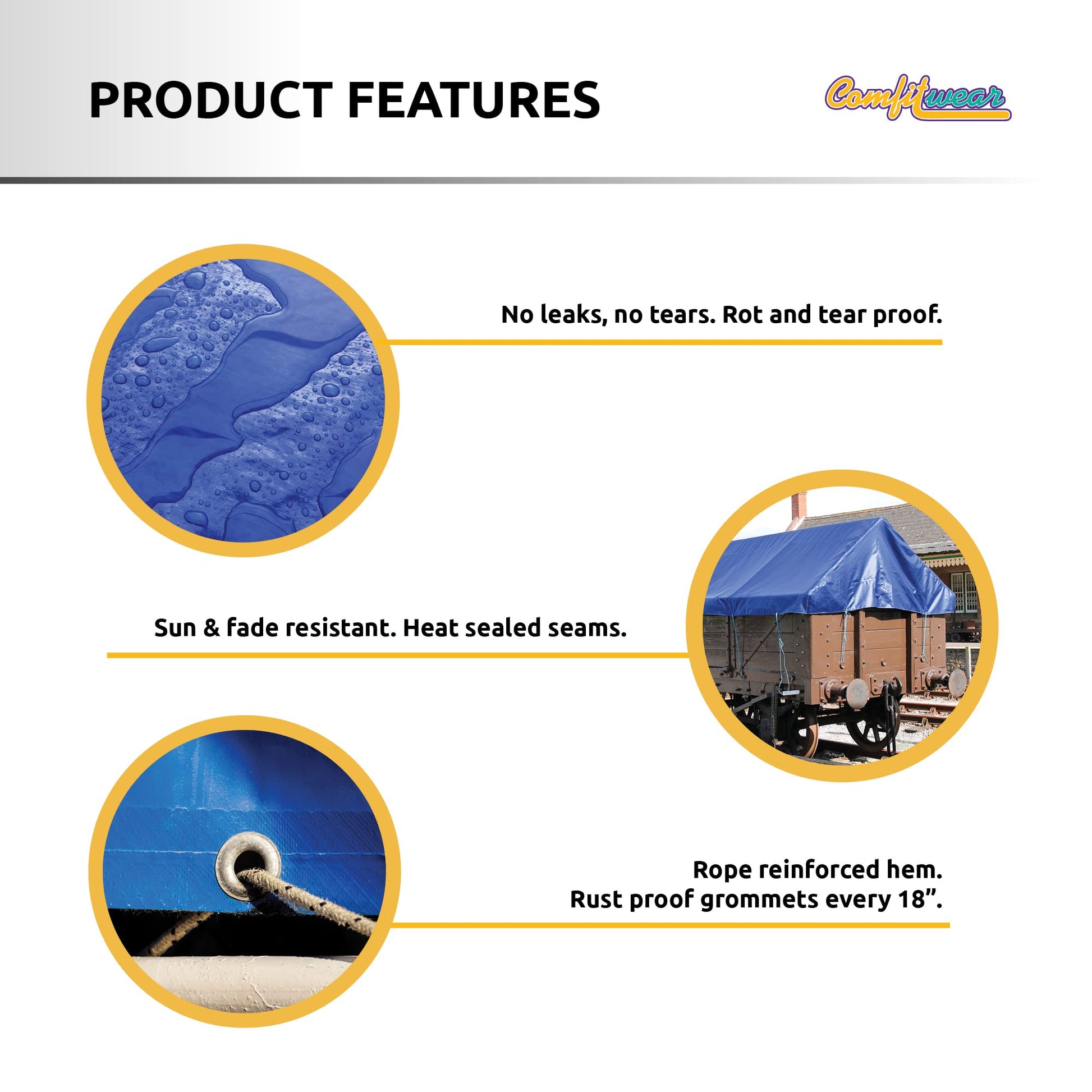 - SECURED TIE-DOWN: This canopy tarp has metal grommets every 3 feet that allow for a secure tie-down against moisture and rain. The waterproof tarp cover is lightweight and easy to move around but will not budge if tied down properly.