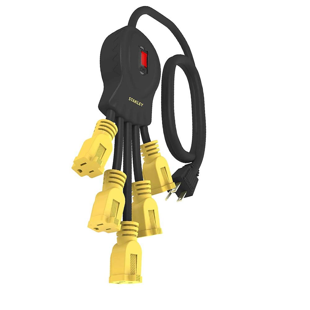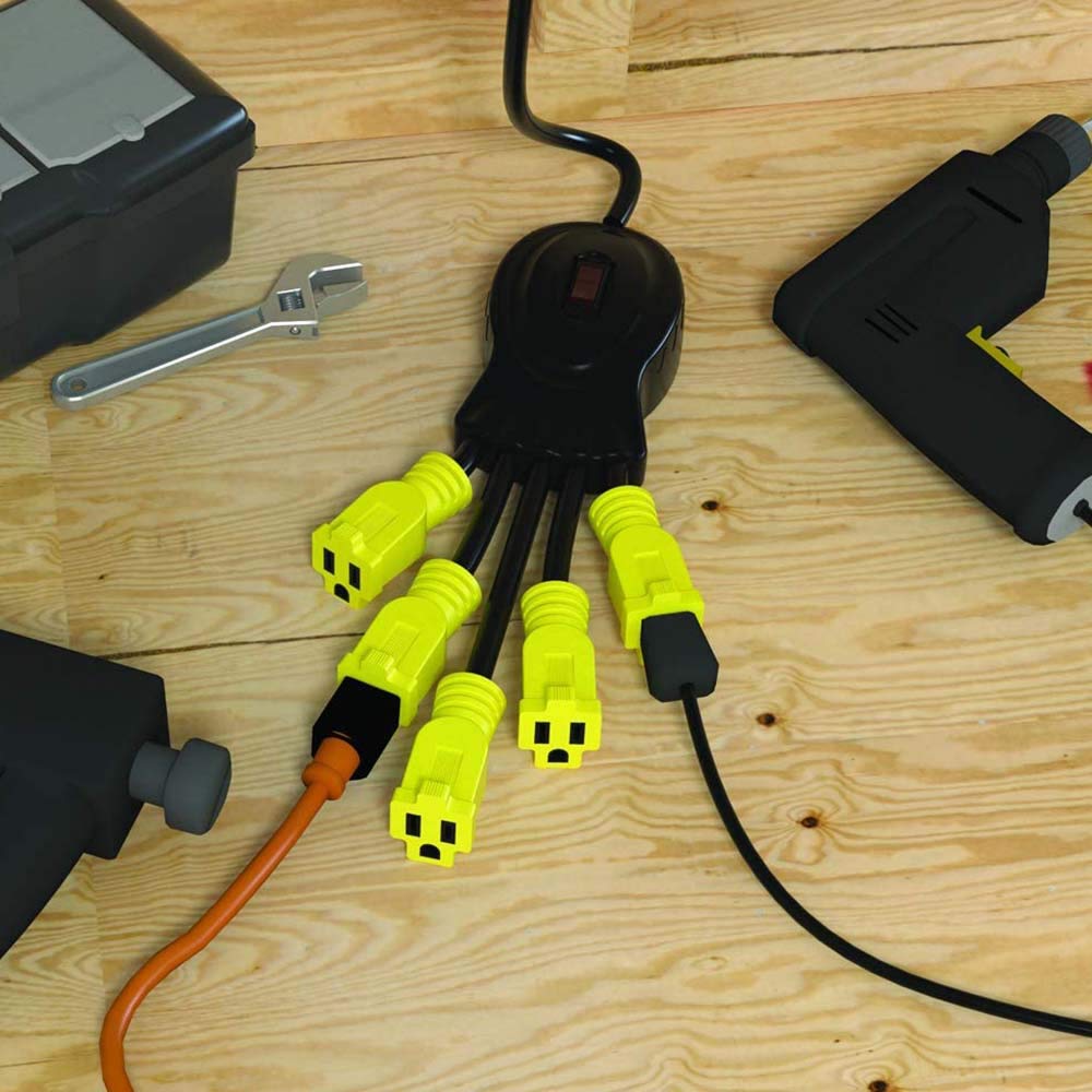 The STANLEY PowerSquid features 5 flexible arms to accommodate bulky adapter blugs. A built in circuit breaker protects your devices from overloads. The powerquids design allows the outlets to be spaced for greater flexibility.